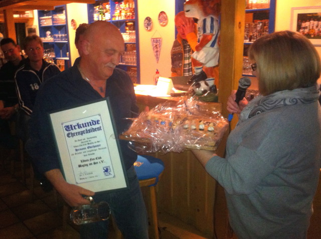 Übergabefeier im Kurhaus Nachdem im März bei der Jahreshauptversammlung bei Abwesenheit des Dietz-Duos der neue Vorsitzende gewählt wurde, fand diesmal im Löwenstadl und in der Kurhaus-Wirtschaft die Verabschiedung und persönliche Übergabe der/des 1. Vorsitzenden statt. Durch den unermüdlichen Einsatz der Dietz' wurde dessen Mühen belohnt mit einem Abschiedsgeschenk in Form eines prächtigen Löwen-Feuerkorbs und der Auszeichnung mit Urkunde als Ehrenpräsidentin und als Ehrenmitglied bei Gatte Hans-Peter. Darauf wurde anschließend noch angestoßen und nach einem genüßlichem Abendessen bei einer kleinen, sehr lustigen Runde gefeiert. Ostern im Nur fünf Kinder kamen am verregneten Ostermontag zum Löwenstadl, um dem Osterhasen auf der Spur zu sein, Aber für die lohnte es sich, im Saal des Kurhauses und nicht auf der nassen Wiese, schöne gefüllte Jutetäschchen in dunklen Ecken aufzuspüren. Bei Schnitzel und Pommes ging es den Junglöwenfans dann ganz gut, was die Kinderherzen höher schlagen ließ. ''''''''''''''''''''''''''''''''''''''''''''''''''' Auswärtsfahrt nach Hannover ganz schön, aber...! Wenn vorne nix reingeht, kriegst du dafür hinten einen rein! Vier Vorstandsmitglieder hatten sich über Nacht auf die Reise nach Hannover gemacht, um die Löwen anzufeuern. Reise und Unterkunft klappte ganz gut, jedoch das Spiel? Unsere Spieler wurden für ihre eigentlich gute Spielweise nicht belohnt. Hochkarätige Chancen wurden vergeben und dafür wieder ein Ei reingekriegt und wieder waren alle Punkte weg. Die Fans ließen sich aber nicht entmuntern und feierten anschließend doch für die eigentlich gute Leistung der Löwen ohne Fortune.