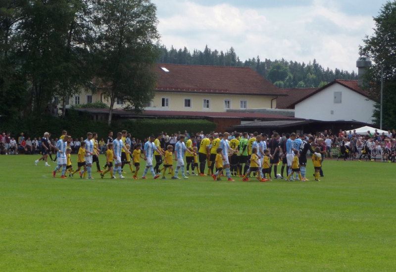 **************************************** SV Kirchanschöring - 1860 0:5 Unsere Löwen waren zu Gast in Kirchanschöring beim frischgebackenen Bayernliga-Aufsteiger und gaben ihnen eine Lehrstunde. Gut 3000 Fans waren ins Stadion an der Laufener Straße gekommen, um die Löwenstars hautnah zu erleben. Ach ja, und da wurde noch das begehrte Autokennzeichen TS V 1860 an den Meistbietendsten vergeben. Das war mit dem Betrag von 2222 Euro zugunsten der Lebenshilfe TS der Tittmoninger Matthias Stadler, dessen Vater ja bereits die 60er-Wurst an den Fan brachte.(rechts Bildmitte neben Stefan Ortega)