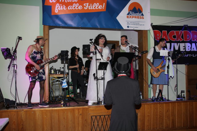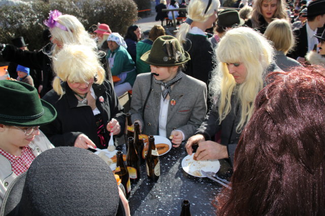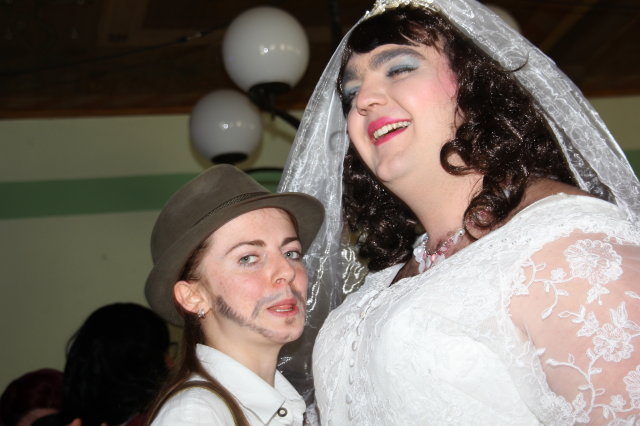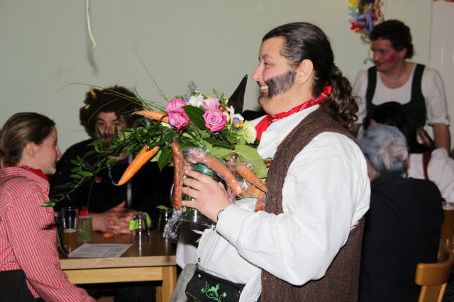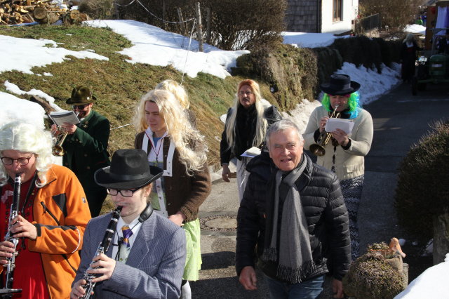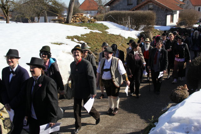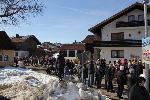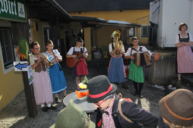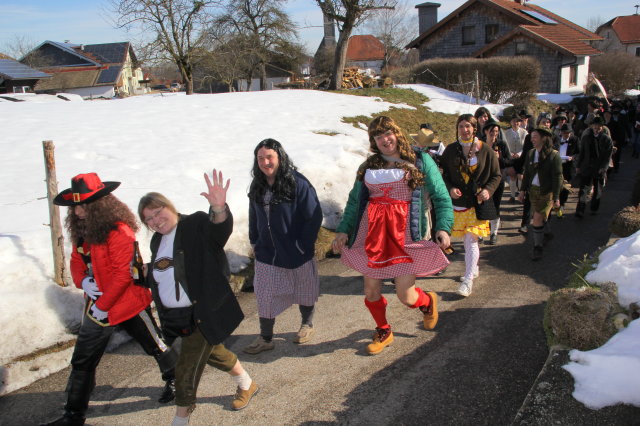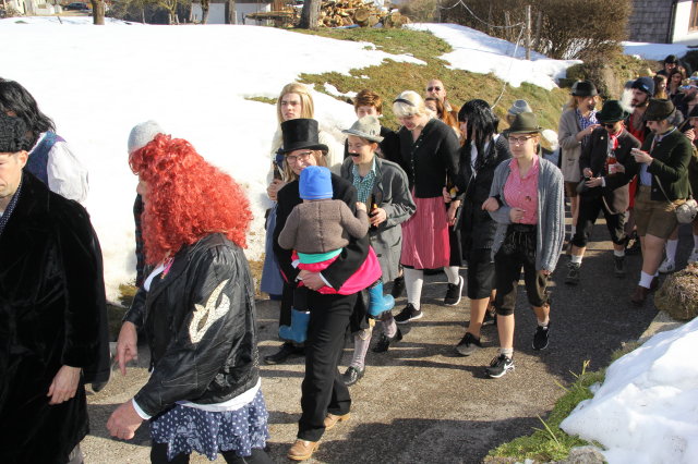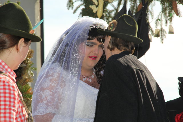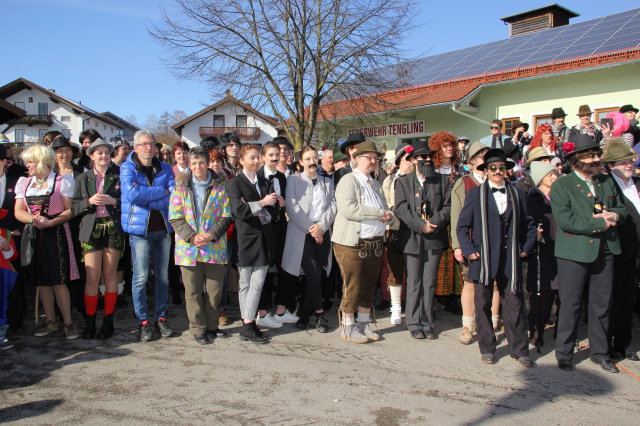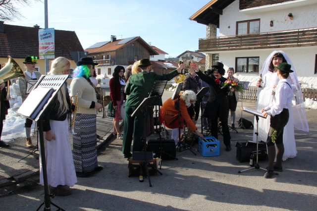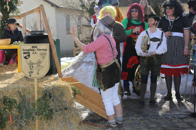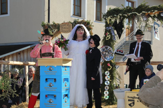 Faschingshochzeit 2019 Die Braut "Annamirl Ganzscheebroad" und da Bräutigam "Bartholomäus da Steggalzoaga" feierten Faschingshochzeit in Tengling. Nach 21 Jahren wurde in Tengling endlich wieder mal auf dem Dorfplatz richtig Hochzeit gefeiert. Bei Weißwürschten zum Frühstück vor dem Feuerwehrhaus bei strahlendem Sonnenschein wurde sich aufgewärmt zur festlichen Trauung auf dem Mist-(Stroh-)haufen am Kindergarten. Die 'Tenglinger Blech' führte sodann den Kirchenzug um die Hennaleitn an, begleitet mit dem Kammatwong des Brautpaars und zahlreichen Hochzeitsgästen. Der Bürgermeister Ursus Dipfescheissa konnte dann nach einigen Zwischenfällen die Trauung vollziehen, umrahmt vom Kirchenchor. Die Hochzeitsgesellschaft wechselte dann nach Taching zum Bergwirt, wo die Feier mit einigen Einlagen und zwei Kapellen bis zum bitteren Ende und - der Scheidung - abgefeiert wurde. alle Fotos von Eurer Liane Maximi