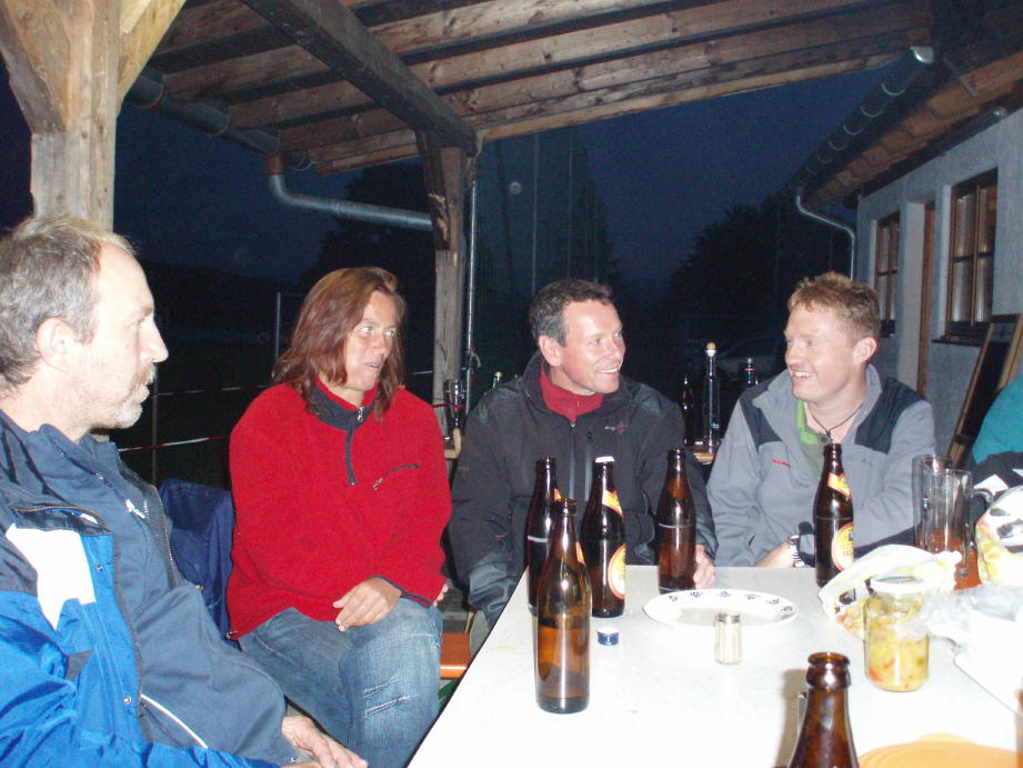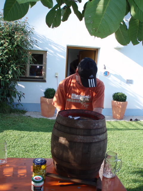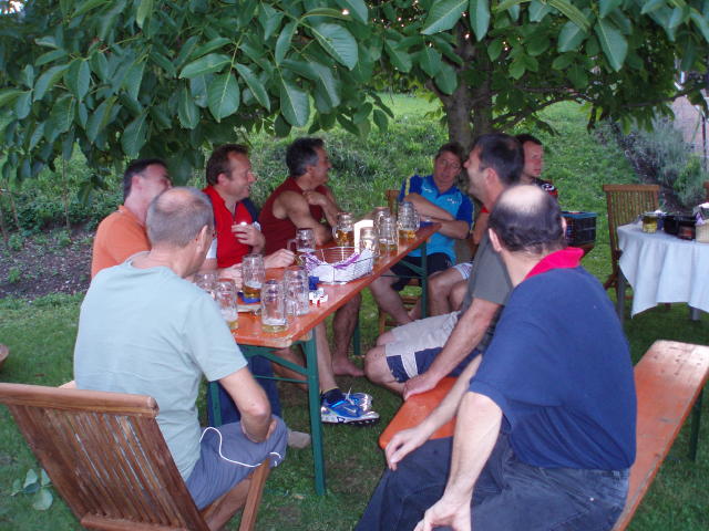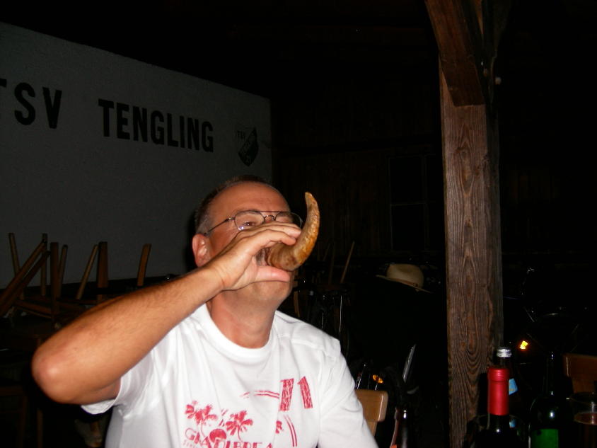 Lammgrillen 2007 Toni Hahn überraschte die AH mit einem spendiertem Schafböckal, das auf einem etwas zu groß angetragenen Grill fast fünf Stunden schmoren mußte. Viele gute Beilagen ergänzten das hervorragend schmeckende Lamm bestens. Sogar die Hörner wurden noch genutzt: Jeder mußte vom Horn eine Füllung 'Hochprotzentiges' auf "Ex" trinken.... |